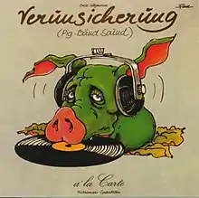 A la Carte is quite a well known French expression (meaning "according to the card") which is used worldwide. The album cover is a satirical take on this, as it shows a green pig's head, wearing headphones and eating a vinyl disc.