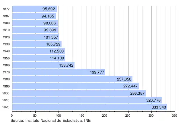 A 2021 sociolinguistic survey found that 22.4% of the adult population spoke Basque, an increase of six percentage points since 2011.[6] Population developmentThe historical population is given in the following chart: ![]() |