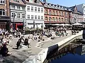 When the river was opened in the 2000s the opportunity to create a new recreational space near the water was realized with the project that became known as Vadestedet (The Ford). The name refers to a ford that used to lead over the river by Immervad. When the river was opened a bridge was established there to connect Frederiksgade to Immervad. Next to the bridge a system of steps was created by the river, initially known as Den Spanske Trappe (The Spanish Steps) in reference to the steps in Rome, but today officially named Vadestedet. The steps lead to the edge of the river and are designed with seating. The Ford has become one of the most popular areas for outdoor recreation in the city and is packed with people in the evenings and when in the daytime when weather permits. The area east of the Ford is packed with bars and cafés and functions as a small leisure district in its own right.[7][8]