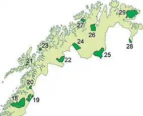 Ånderdalen National Park (Norwegian: Ånderdalen nasjonalpark) is located on the large island of Senja in Troms og Finnmark county, Norway. The 134-square-kilometre (52 sq mi) park lies within Senja Municipality. The park was established by royal decree on 6 February 1970 and it was enlarged in 2004. The national park preserves this Northern Norwegian coastal landscape. The bedrock consists of hard granite rocks and the landscape image gives exciting impressions of the glacial forces that have worked on Senja. The coastal pine forest in Ånderdalen has in some areas primeval forest with over 600 years old trees and countless marble pines and lower. Along the river there are many lush hawked birch forests and floodplain forests.[1]