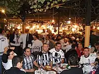 The name of the group comes from the central market place of Beşiktaş district, which is located in downtown, near the Istanbul Bosphorus. Beşiktaş Çarşı contains many restaurants, bars, a big fish market, and also numerous cosmetics, clothing and technology shops. There the fans assemble and pass their time with various activities until the matches. It is possible to see the fans on match days, wearing black-and-white jerseys at the fish restaurants and bars.[6] Also, the newly produced chants by Beşiktaş fans are usually sung and embraced for the first time in Beşiktaş Çarşı.[11]