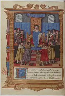 The "Master of the Puys de Rouen" (loosely, "... of the Hills of Rouen") was engaged for several projects by Étienne Colaud, notably on the so-called "Rouen Manuscript", the work for which he was the principal illustrator, and from which he acquires the name by which he is generally known by scholars.[11] He was active in Paris between 1520 and 1540. His style is characterised by exaggeratedly square-jawed figures, firm outlines and voluminous architectural framing. In addition to the works he produced for Colaud, several other significant manuscripts are attributed to him, including an Evangelion for the Duprat family, a Book of Hours which recently appeared on the London art market through a dealer called Sam Fogg,[10] and another Book of Hours sold by the specialist dealer "Les Enluminures" in 2008. The German art historian Eberhard König has suggested this last work might be attributed to Henri Laurer, an artist from Paris who moved to Mirepoix (far away, south of Toulouse) but the attribution was not endorsed by other specialist scholars.[1]