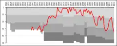 A chart showing the progress of Östers IF through the swedish football league system. The different shades of gray represent league divisions.