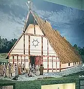 Some Unetice buildings were exceptionally large, such as the Dermsdorf longhouse (44m x 11m) and Zwenkau longhouse (57m x 9m), both in central Germany. These may have been elite residences, cult buildings, meeting halls, or 'men's houses' for groups of warriors or soldiers under the command of individual rulers.[68][56][80][81][82] The Dermsdorf longhouse was built a short distance from a settlement at Leubingen, in direct alignment with the nearby Leubingen burial mound. A large number of axes were ritually deposited together in front of the longhouse, which may have belonged to a contingent of warriors or soldiers.[56]