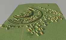 The vast majority of settlements consisted of several houses congregated in the communal space of the village or hamlet. Larger fortified villages, with ramparts and wooden fortifications, have been discovered as well, in, for example Bruszczewo in Greater Poland[69] and Radłowice in Silesia.[70] These larger villages played a role as local political centres, possibly also market places, facilitating the flow of goods and supplies. The 'proto-urban' fortified settlement of Fidvár in Slovakia was an important centre for the exploitation of nearby gold and tin deposits.[71][72] Hillforts are known from the Late Unetice period, such as Cezavy in the Czech Republic which featured stone fortification walls.[73][74]