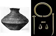 A gold axe and jewellery dating from c. 1800 BC were discovered at Dieskau in Germany and are thought to be associated with the ruler buried in the Bornhöck mound.[41] A gold dagger dating from the Early Bronze Age has also been recovered from Inowrocław in Poland, associated with the Iwno culture.[42][41] Gold weapons are known from other parts of Europe in this period, including a gold axe from Tufalau in Romania belonging to the Wietenberg culture,[43] a gold dagger from Mala Gruda in Montenegro belonging to the Cetina culture,[44] and gold daggers and halberds from Perșinari and Măcin in Romania belonging to the Tei culture.[45] The Tei culture weapons were found buried with gold bracelets of Unetice type.[46]