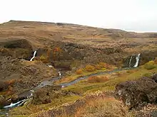 Þjórsárdalur (Icelandic pronunciation: [ˈθjour̥sˌaurˌtaːlʏr̥] ) is a ⓘvalley in Árnessýsla county in Iceland that lies between mount Búrfell alongside the river Þjórsá to the east and mount Skriðufell to the west. The valley is quite flattened over and pumicey after repeated eruption of the nearby volcano Hekla as well as other volcanoes in the vicinity like the Vatnaöldur volcanic system which produced Iceland's biggest known lavafield Þjórsá Lava (Þjórsárhraun) in prehistoric times or the Grímsnes volcanic system with the crater Kerið. Landmarks in Þjórsárdal include Þjóðveldisbærinn Stöng, Gjáin, Háifoss, and Vegghamrar.