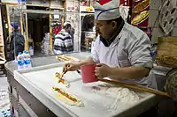 İçli pide (Turkish: İçli pide, lit. 'Stuffed bread'), also called simply pide, is a savory dish of Turkish Black Sea origin consisting of a usually rounded, flattened base of leavened wheat-based dough topped with tomatoes, cheese, and often various other ingredients (such as meat, kaşar, beyaz peynir, and other ingredients), which is then baked at a high temperature, traditionally in a wood-fired oven.[1] A person who makes pide is known as a pideci.
