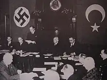 İnönü knew very well the hardships which his country had suffered during decades of incessant war between 1908 and 1922 and was determined to keep Turkey out of another war as long as he could. The young Turkish Republic was still re-building, recovering from the losses due to earlier wars, and lacked any modern weapons and the infrastructure to enter a war to be fought along and possibly within its borders. İnönü based his neutrality policy during the Second World War on the premise that Western Allies and the Soviet Union would sooner or later have a falling out after the war.[44] Thus, İnönu wanted assurances on financial and military aid for Turkey, as well as a guarantee that the United States and the United Kingdom would stand beside Turkey in the event of a Soviet invasion of the Turkish Straits after the war. In August 1944 İnönü broke off diplomatic relations with Germany and on 5 January 1945, İnönü severed diplomatic relations with Japan.[45] Shortly afterwards, İnönü allowed Allied shipping to use the Turkish straits to send supplies to the Soviet Union and on 25 February 1945 he declared war on Germany and Japan.[41] For this Turkey became a founding member of the United Nations.