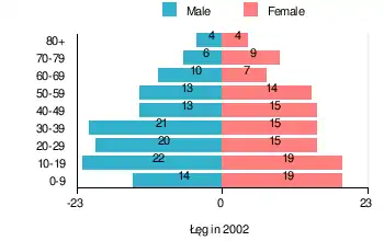 (by age group in 2002)TOTAL 0-9 10-19 20-29 30-39 40-49 50-59 60-69 70-79 80 + I. TOTAL person 240 33 41 35 36 28 27 17 15 8 — of which in % 100 13.8 17.1 14.6 15 11.7 11.3 7.1 6.3 3.3 1. BY SEX A. Males person 123 14 22 20 21 13 13 10 6 4 — of which in % 51.2 5.8 9.2 8.3 8.8 5.4 5.4 4.2 2.5 1.7 B. Females person 117 19 19 15 15 15 14 7 9 4 — of which in % 48.8 7.9 7.9 6.3 6.3 6.3 5.8 2.9 3.8 1.7