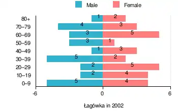 According to the 2002 Poland census, there were 55 people residing in Łagówka village, of whom 47.3% were male and 52.7% were female. In the village, the population was spread out, with 27.3% under the age of 18, 27.3% from 18 to 44, 14.5% from 45 to 64, and 30.9% who were 65 years of age or older.[1]