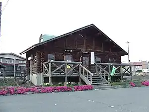 The station has one side platform, serving a bidirectional single track. The station building is built in the style of a log cabin. The station is unattended.