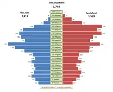 The Ōtsuki Town Hall displays its demographics on its homepage. These statistics are updated bi-monthly. The population of Ōtsuki peaked at 13,688 in 1960, and has seen a steady yearly decline since.[9] Ōtsuki has issues with rural flight and population decline, much like other parts of rural Japan.[10][11] As can be seen in the graph provided, the majority of residents in Ōtsuki were between 45 and 84 years of age in 2006. As of August 2014, Ōtsuki contains 2,785 households, with an overall estimated population of 5,719, and a gender ratio of 1.11 females to each male.[10]