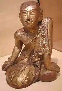 Śāriputra assumed a leadership role in the Buddha's monastic community, or Sangha. Buddhist texts describe that Śāriputra routinely took charge of monastic affairs usually handled by the Buddha himself, such as attending to sick monks or visiting lay followers before their deaths.[50] In one instance, when a group of monks planned to travel elsewhere, the Buddha told them to ask Śāriputra for permission first.[50] Śāriputra was the first disciple of the Buddha who was asked to ordain monks in his place, with the Buddha giving him the ordination procedure. He was also entrusted to ordain the Buddha's son Rahula.[59] When Śāriputra trained pupils, he gave them material and spiritual help, and assigned them an object of meditation.[60] In the Saccavibhanga Sutta, the Buddha compared Śāriputra to a mother who gives birth to a child while comparing Maudgalyāyana to a nurse who raises a child. Śāriputra would train students to sotapanna, the first stage of enlightenment, and Maudgalyāyana would train students to arhatship, the highest stage of enlightenment.[55][60][note 3] However, Nyanaponika Thera notes that there are several individual cases where Śāriputra guided monks to the higher stages of enlightenment as well.[62]