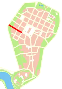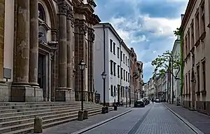 To the west, the street heads to a former Jewish quarter, hence its former name, Żydowska Street (Ulica Żydowska, lit. Jewish Street).[2] Historically, the street saw the location of a synagogue, cemetery and a Jewish bath house until the fifteenth-century, when the Jewish population was moved to the north to the present location of Szczepański Square.[3] The etymology of the street derives from the presence of the Church of St. Anne. The street features several university-related buildings, formerly housing colleges, dormitories and a library.[4]