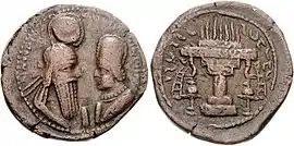 Ardashir I, who was the first king of the Sasanian Empire, had used the older word ērān (Parthian aryān) as part of his titles and in accordance with its etymology. At Naqsh-e Rostam in Fars province and the issued coins of the same period, Ardashir I calls himself Ardašīr šāhānšāh ērān in the Middle Persian version and šāhānšāh aryān in its Parthian version both meaning “king of kings of the Aryans.” His son Shapur I referred to himself as šāhānšāh ērān and anērān (lit. "king of kings of the Aryans and the Non-Aryans") in Middle Persian and šāhānšāh aryān and anaryān in Parthian. Later kings used the same or similar phrases.[6] and these titles became the standard designations of the Sasanian sovereigns.[5]