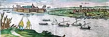 In 1475, King Matthias had in his Danube Flotilla around 330 chaika with 10,000 men, among which were 1,700 lancers, 1,200 men-at-arms, while "the rest were catapultists and crossbowers".[1] In the Belgrade port, 34 chaika with 18 oars, 18 soldiers and a catapult at the front were stationed.[1] Larger chaika, of which there were 16, had 24 oars and 300-man-crew, 4 large guns at the front, "from which 100-pounds of weight of shots, 100 carbott or pisside (types of shells), and 200 hand-guns, were shot".[1] Apart from the ordinary chaika, there were larger ones, called "galleys".[1]