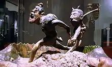 Most of the devils are sculptures in wood, ceramic, stone, or paper. Others are masks or paintings on silk or canvas. The devils, collected from all over the world, are diverse in style. Many of the devils are art objects, for display only, but other devils have been incorporated into usable objects such as pipes and nutcrackers.[1] Many of the items represent folk myths and others express modern political ideas. For example, one sculpture depicts Hitler and Stalin as devils in a dance of death over a pile of human bones.[1][3]