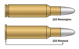 The .222 Rimmed is a centrefire rifle cartridge, originating in Australia in the 1960s as a cartridge for single shot rifles, particularly the Martini Cadet action. Performance is similar to the .222 Remington on which it is based however loads should be reduced as the walls of the brass cases are generally thicker.[2] Extraction of cases that have been loaded to higher pressures can be difficult due to the inefficient extraction method utilised by the Martini Cadet.