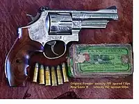 Smith & Wesson wished to pair their new revolver design with a worthy new ammunition chambering.[5] At the time, smokeless powder was state of the art in ammunition technology. Older black-powder ammunition was in the process of being converted to smokeless. Smith & Wesson's popular .44 Russian cartridge had established a reputation for superb accuracy and was a renowned target load, and they decided to use an improved smokeless powder version as the basis for the new round. Due to the lower energy density of the early semi-smokeless powders, prior efforts to convert the .44 Russian to smokeless had produced less than stellar ballistic performance. Smith & Wesson addressed this issue by lengthening the .44 Russian cartridge case by 0.190-inch (4.8 mm) and increasing the powder capacity by 6 grains (0.39 g).[6] The resulting design, which S&W called the .44 Special, had a case length of 1.16-inch (29 mm).[5]