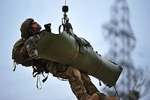 ![]() 123rd Special Tactics Squadron pararescueman, is hoisted into a HH-60 Pave Hawk helicopter | |