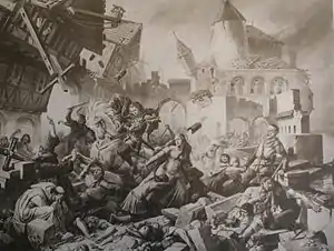 After a foreshock between 19:00 and 20:00 local time, the main earthquake struck at around 22:00, and numerous aftershocks followed through that night.[4] Basel experienced a second, very violent shock in the middle of the night. The town within the ramparts was destroyed by a fire when torches and candles falling to the floor set the wooden houses ablaze. The number of deaths within the town of Basel is estimated at 300. All major churches and castles within a 30 km (19 mi) radius of Basel were destroyed.[5]