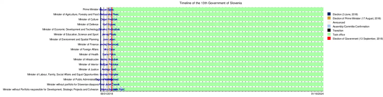 The 13th Government of Slovenia was elected on 13 September 2018 by the 8th National Assembly. It is the first minority government in the history of Slovenia. On 27 January 2020, following the resignation of the Minister of Finance Andrej Bertoncelj, Prime Minister Marjan Šarec announced his resignation. The National Assembly was informed on the same day following which the term of the 13th Government ended.[1] Šarec is the third consecutive and in total fourth Prime Minister to resign, before him Miro Cerar, Alenka Bratušek and Janez Drnovšek resigned as well, the latter due to being elected President of the Republic. The 13th Government is the fifth consecutive and eighth government in total to not finish its term.