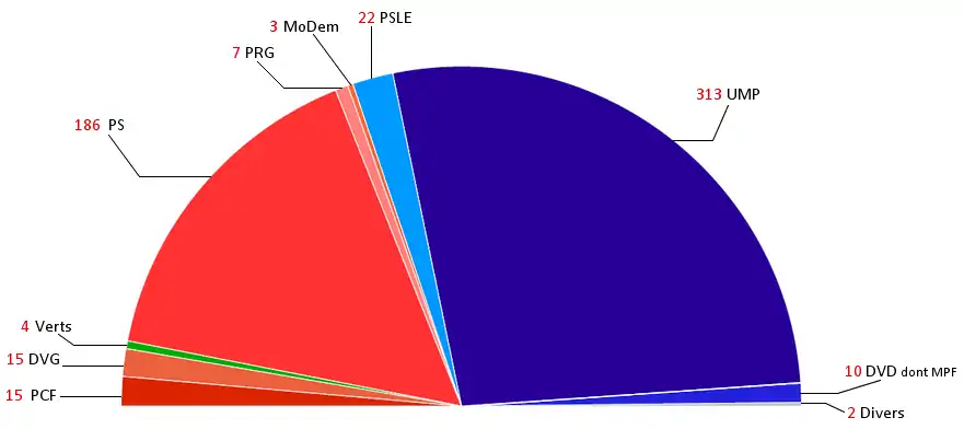 Union for a Popular Movement | 10,289,737 | 39.54 | 98 | 9,460,710 | 46.36 | 215 | 313 | |
