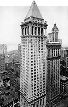 The first stage of construction commenced in April 1910 with the demolition of the Gillender Building,[12] which The New York Times claimed to be the first skyscraper that was demolished to make way for a taller skyscraper.[13] Demolition of the Stevens Building started the same month,[12] and both buildings had been demolished by June 1910.[49][86] After the site had been cleared, foundation work was started.[49][73] Foundational work was stymied due to the quicksand in the ground, as well as the presence of redundant supports underneath the Gillender Building's site and the proximity of other buildings.[28] Steel superstructure construction commenced after foundational work was completed in November 1910,[37] and the steel had reached the ground level by December 20, 1910.[45] Facade work commenced in February 1911,[36] with contractor Marc Eidlitz & Son erecting the facade at a rate of three-and-a-half stories per week.[37] The building topped out on June 14, 1911.[45] The stonework was completed by September 15, 1911, except for the pyramid, for which there had been a minor change in design.[36]