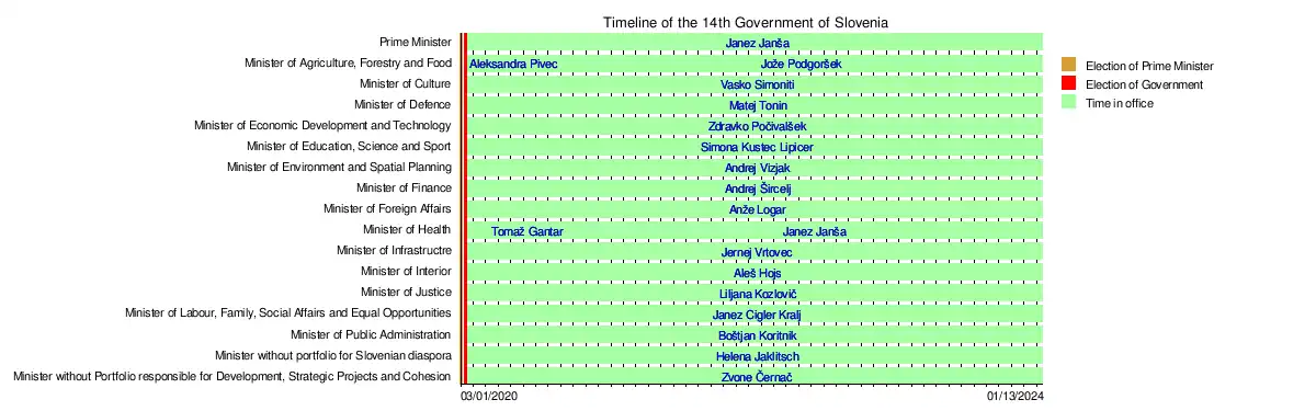 The 14th Government of Slovenia was formed following the resignation of Prime Minister of the 13th Government Marjan Šarec in January 2020. Janez Janša of Slovenian Democratic Party formed a coalition with Modern Centre Party, New Slovenia, and Democratic Party of Pensioners of Slovenia. The government was confirmed on 13 March 2020, amidst the COVID-19 pandemic.