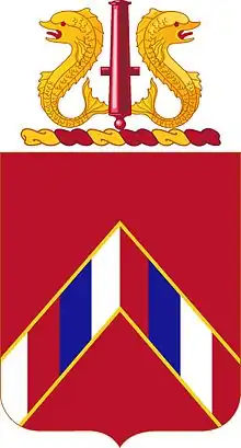 The shield is red for the Artillery and the chevron is in the colors of the old royal Hawaiian flag, which also appeared in the arms of the Coast Defenses of Pearl Harbor.
