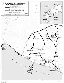 After leaving Biak, the 162nd and the division staged at Mindoro in preparation for the liberation of the Southern Philippines. The 186th Regimental Combat Team landed on Palawan on 28 February in order to secure airfields there from which the Japanese lines of communication in the South China Sea could be blockaded. To capture airfields even closer to the Dutch East Indies and the strategic oilfields of Borneo, planners selected the southern tip of the Zamboanga Peninsula on Mindanao as the next target.[7] The rest of the 41st Infantry Division was committed to this operation, and entered Basilan Strait early on 10 March. The invasion beaches had been targeted by three days of naval bombardments which had disabled some of the Japanese artillery inland.[8] For the Mindanao operations, the 205th Field Artillery Battalion was organic to the 162nd RCT to provide direct support.[9] The 162nd Infantry was tasked with assaulting the beach near the barrio of San Mateo, but faced very little resistance from the Japanese. The leading assault wave, touching down around 0915, was faced with light machine gun fire and subsequent troops encountered artillery and mortar fire from the high ground inland, but the regiment suffered no casualties. The 162nd secured the abandoned landing strip of Wolfe Field half a mile inland and spread out in an advance in all three directions outwards from the beachhead. The 163rd Infantry followed within twenty minutes and within several hours had begun advancing directly east on Zamboanga City. Before halting at nightfall, the 162nd advanced 1.5 miles inland and the same distance to the west along the southern coast of the peninsula. By dusk on 11 March, both regiments secured the coastal plain, as the Japanese 54th Independent Mixed Brigade and the rest of the nearly 9,000 Japanese troops on the peninsula had withdrawn to defensive positions on the high ground 2–3 miles inland, from which they could observe the American troops on the beachhead. To the northwest, the advance of the 162nd reached the former Japanese seaplane base of Caldera Bay, while on the inland axis the regiment advanced two miles inland to Malisay and to San Roque a mile and a half southeast of Malisay. The 163rd secured the rubble of Zamboanga City, destroyed in preinvasion bombardment, and captured San Roque Airfield, which was quickly repaired to serve as an airstrip.[8]