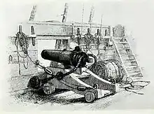 About 300 aboriginals, men, women and children, who had banded together approached the Risdon Cove settlement whilst occupied on a kangaroo hunt. The aboriginal people had arrived at the settlement and some were upset by the presence of the colonists. There had been no widespread aggression, but if their displeasure spread and escalated, Lieutenant Moore, the commanding officer at the time, and his dozen or so soldiers, could not be expected to be able to protect the settlement from a mob of such size. The soldiers were therefore ordered to fire a 12-pounder carronade (a short-barrel, heavy calibre naval cannon known to sailors as "the smasher") in an attempt to disperse the aboriginals. The clergyman Robert Knopwood heard "roar of the cannon at Risdon at 2 p.m". That being said, at least a second shot would be necessary to adjust the elevation and windage. The 12-pounder carronade was one of two ordered to be salvaged from the ship Investigator, by Governor King and given to Lieutenant Bowen, "unmounted". The 12-pounder carronade weighed 330 kg (728 lb). A carronade is a short, smoothbore, cast-iron cannon which was used by the Royal Navy. It was first produced by the Carron Company, an ironworks in Falkirk, Scotland, and was used from the mid-18th century to the mid-19th century. It was probably a blank round, although some historians allege grape shot was used to explain an alleged but uncorroborated high figure of deaths.