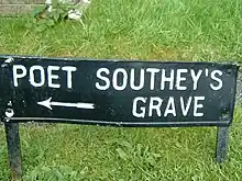 Sign to Robert Southey's grave, St. Kentigern's Churchyard, Crosthwaite, Cumbria, England