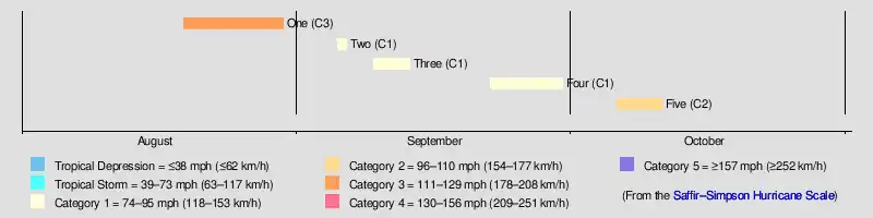 Every tropical cyclone in the season was of hurricane status, or with winds at or exceeding 74 mph (119 km/h). In only two other seasons did every cyclone attain hurricane status; those years were 1858 and 1884.[1] All five cyclones affected land; the strongest was the first storm, which caused severe damage and loss of life when it made landfall near the border between Mississippi and Alabama. The second storm of the season struck Puerto Rico, where it caused over 100 deaths, primarily from flooding. In the middle of September, the third storm moved across Florida with strong wind gusts and light rainfall, and a week later the fourth storm passed over or north of the Lesser and Greater Antilles. The last storm hit the Florida Panhandle, though damage was less than expected.