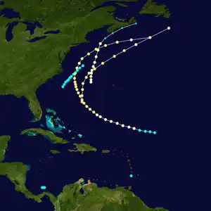 A Category 2 hurricane on the modern-day Saffir-Simpson hurricane wind scale was first seen on August 18, while located approximately 620 miles (1,000 km) east of Florida. Over the next three days, it tracked north and moved parallel to the East Coast of the United States. The system dissipated roughly 310 miles (500 km) south of Newfoundland on August 21.[4]