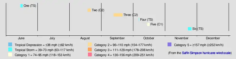 The first tropical cyclone was observed as a tropical storm offshore the East Coast of the United States from June 15 to June 17. The second and third systems were active in mid-August and mid-September, respectively, and both attained Category 2 intensity at their peaks on the modern-day Saffir-Simpson hurricane wind scale and neither made landfall. A fourth tropical cyclone caused flooding in Saint Lucia and brought heavy rain to parts of Barbados on October 5, but its track prior to that date is unknown. The fifth hurricane was known to be active for a few days in October off the East Coast of the United States. Finally, a sixth system was centered near Panama – between November 22 and November 25.