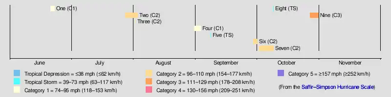 The strongest storm of the season was Hurricane Nine, or the San Narciso hurricane. It developed in the Central Atlantic, and moved west to impact the Leeward Islands and Greater Antilles. The storm system was a major Category 3 hurricane on the Saffir-Simpson hurricane scale, meaning the hurricane had maximum sustained winds of 111–130 mph (178–209 km/h). This was the costliest, and deadliest, storm of the season, causing at least $1 million (1867 USD) in damage, and at least 800 deaths[4] across the Caribbean Sea.