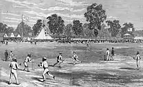 On Boxing Day 1866, in front of over 10,000 spectators, Wills captained the team against the Melbourne Cricket Club at the Melbourne Cricket Ground. Bell's Life in Victoria reported: "Seldom has a match created more excitement in Melbourne than the one under notice, and never within our recollection has a match given rise to so much feeling on behalf of the spectators."[5] "The veteran Wills never captained an eleven who so thoroughly possessed the sympathies of the spectators," wrote a Melbourne correspondent for The Sydney Mail. "A dark skin suddenly became a passport to the good graces of Victorians."[6] Although they lost to the MCC, the Aboriginal players were commended for their performance, and showed marked improvement on a subsequent tour of country Victoria.