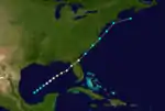 The steamship Jamaica first encountered this system on August 31 about 150 mi (240 km) northeast of Sombrero, an outlying island of Anguilla.[17] Initially a tropical storm, the system strengthened to a hurricane later that day. The storm intensified further, reaching Category 2 intensity prior to striking the Turks and Caicos Islands around 18:00 UTC on September 2. About 24 hours later, the cyclone peaked as a Category 3 hurricane with maximum sustained winds of 125 mph (205 km/h). On September 4, the storm made landfall along the coast of modern-day Villa Clara Province. Weakening to a Category 1 hurricane by early on the following day, the system turned southwestward over Cuba and remained over land until emerging into the Yucatán Channel several hours later. The hurricane then crossed the channel and made landfall near the northeastern tip of the Yucatán Peninsula on September 6. After weakening to a tropical storm, it briefly re-strengthened into a Category 2 hurricane while moving southwestward in the Bay of Campeche. Thereafter, the storm weakened back to a Category 1 prior to its landfall near Coatzacoalcos, Veracruz, early on September 8 and soon dissipated.[2]
