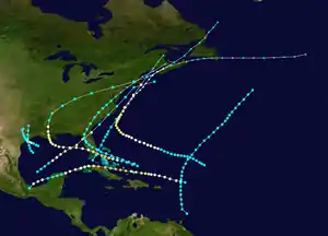 A tropical storm formed south of Key West on September 23 and began moving northeast. It travelled parallel to the coast of Georgia, where it produced winds of 65 mph (105 km/h; 29 m/s) before becoming a Category 1 hurricane on September 26. It continued heading northeastward before it became extratropical on September 27 near the Gulf of St Lawrence.