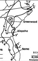 In the Bahamas, the hurricane damaged fruit trees, crops, and fences, especially on the Abaco Islands, Harbour Island, and New Providence.[11] Despite South Florida at the time being sparsely-populated, widespread damage occurred as far north as Sebastian.[12] The highest wind reported in South Florida was 60 mph (97 km/h) at Jupiter,[13] and the heaviest rainfall was 2.02 in (51 mm) at that location.[14] Farther north, winds at Sebastian Inlet were estimated at 75 mph (121 km/h), downing trees and telegraph poles, beaching many small boats, and causing local fruit groves "several thousand dollars" in damage.[12][15] Additionally, the hurricane reportedly produced a storm surge of 14 feet (4.3 m) "on the beaches near Miami."[12] In the Big Bend region of Florida, several yachts to capsized at Cedar Key. Winds in Pensacola peaked at 60 mph (97 km/h), badly damaging local property.[15] Slightly lesser winds in Mobile, Alabama,[14] prostrated trees and fences, and deroofed a few homes.[16] Flooding from the storm surge inundated the waterfront to a depth of 3 ft (0.91 m) and areas as far as two to three blocks inland from the Mobile River.[15][16] Along the Mississippi River Delta, the storm produced severe flooding.[12] Rainfall in New Orleans totaled 7.9 in (201 mm) over a 12-hour period, and winds in the city reached an estimated 90 mph (145 km/h),[14] unroofing many buildings, felling numerous trees, and blowing down fences. In many areas, strong winds downed at least one-third of the timber, and damage to rice, sugarcane, corn, and cotton crops was significant.[15][16] The storm produced heavy rainfall and high winds along much of its path across the Mississippi Valley, the Mid-Atlantic states, and the Northeastern United States.[14]