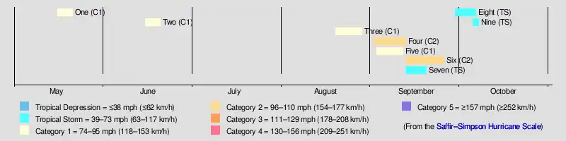 On September 12, a tropical storm formed over the northern Lesser Antilles. It moved westward across the northern Caribbean, and on the 18th, hit the eastern Yucatán Peninsula as a Category 2 hurricane. After weakening over land, it turned northward, where it again strengthened to a Category 2. While moving northeastward over the Gulf of Mexico, it weakened, and hit near Pensacola, Florida on the 23rd. Its minimal intensity at its U.S. landfall resulted in little damage, but Yucatán fared a little worse. No damage was severe.