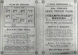 The 1894 Wimbledon Championships took place on the outdoor grass courts at the All England Lawn Tennis Club in Wimbledon, London, United Kingdom. The tournament ran from 9 July until 18 July.[1] It was the 18th staging of the Wimbledon Championships, and the first Grand Slam tennis event of 1894.[2]