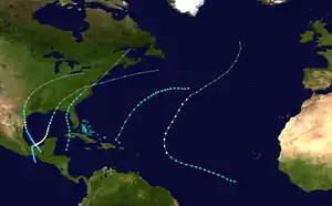 One | June 12–16 | Tropical storm | 60 (95) | 997 | Cuba, East Coast of the United States (Florida), Atlantic Canada | Minor | None | |||
