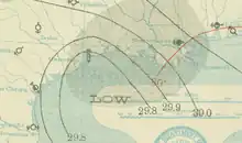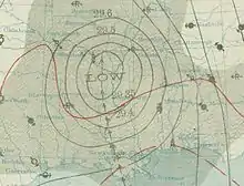 Observations from a ship and weather maps indicate that a tropical depression developed near the north coast of Isla de la Juventud on September 24.[30][1] Moving northward, the depression soon struck the Caribbean coast of modern-day Artemisa Province in Cuba.[1] Heavy rainfall and gusty winds were reported in the now defunct Santa Clara Province.[31] The depression emerged into the Gulf of Mexico and failed to intensify further before making landfall near Naples, Florida late on September 25. Moving northeastward, the cyclone emerged into the Atlantic Ocean and strengthened into a tropical storm around 12:00 UTC on September 26. About 24 hours later, the system peaked with maximum sustained winds of 60 mph (95 km/h). Thereafter, the storm began weakening.[1] However, on September 28, a ship observed a barometric pressure of 1,000 mbar (30 inHg), the lowest known in relation to the storm.[30] Around 00:00 UTC on September 29, the cyclone weakened to a tropical depression just west of Bermuda and dissipated shortly thereafter.[1]