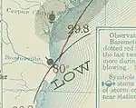 The final storm of the season formed in the extreme southern Caribbean on October 9, and steadily intensified as it moved northwestward. Shortly after making landfall on the western tip of Cuba, the storm peaked as a severe hurricane corresponding to Category 4 on the Saffir-Simpson Hurricane Scale and completed a counterclockwise loop.[5] During its loop, the pressure in its eye dropped to 924 mb (27.29 inHg)[5] with an unofficial reading of 917.71 mb (27.10 inHg) aboard the steamship Brazos.[1] The cyclone began weakening and tracking toward the United States, and moved ashore near Fort Myers, Florida, with winds of 110 mph (180 km/h) corresponding to those of a strong Category 2 hurricane.[5] After moving through the state, it hugged the coast of the Southeastern United States on its way out to sea.[10] Due to the storm's tight and poorly documented loop, initial reports suggested that it was actually two separate cyclones that developed and affected land in rapid succession. Its track was subject to much debate at the time, and eventually it was identified as a single storm. Additionally, observations on the event resulted in a greater understanding of other weather features that took similar paths.[10]