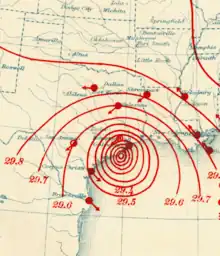 In Dominica and Martinique, the storm caused damage to the shipping industry.[2][11] As the storm passed north of Jamaica, it produced winds of 80–90 mph (130–140 km/h),[12] causing major losses to the island's banana, beet,[13] and sugar plantations.[14] Additionally, storm surge washed out roads and destroyed wharves.[12][15] A total of 15 fatalities and about $10 million in damage occurred in Jamaica.[14][15] Strong winds in the Cayman Islands caused substantial damage, including the destruction of most houses and coconut trees on Cayman Brac, while all buildings on Little Cayman were demolished.[16] Ten people died after the schooner Curaçao sank just offshore Grand Cayman.[17] In the western extremity of Cuba, the hurricane destroyed all homes at Cape San Antonio and caused 14 deaths throughout the country. The hurricane also caused 101 deaths over the Gulf of Mexico, with most being a result of the steamer Marowjine capsizing in the Yucatán Channel.[11] Storm surge inundated many cities along Galveston Bay, in some cases destroying entire towns.[18] Galveston itself was mostly protected by a seawall, aside from 200 outlying homes that were undermined by erosion. Overall, about 90 percent of homes on Galveston Island not protected by the seawall were demolished. Most buildings suffered some degree of impact in Houston, with damage totaling $1 million.[11] Elsewhere in East Texas, the storm produced strong winds and rainfall up to 19.83 in (505 mm) at San Augustine,[19] causing extensive losses to cotton crops and infrastructure.[11] At least 275 fatalities were reported in Texas, with most along the coast or at sea.[19] Later in its duration and as an extratropical cyclone, the storm caused heavy precipitation and river flooding. In Arkansas, levees breaches along the White River,[20] as did the Mississippi River in Illinois, submerging entire towns.[21] In Missouri, the city of St. Louis observed its rainiest 24-hour period on record. Flooding along River des Peres and Meramec River killed 20 people and destroyed more than 1,000 homes.[22] Damage throughout the United States totaled approximately $20 million.[23] The hurricane was responsible for at least 403 fatalities throughout its path.[24]