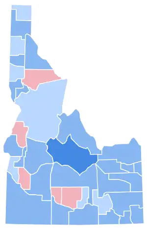The consequence of these trends was that Idaho would vote strongly for Wilson over Republican nominee Charles Evans Hughes, who was viewed as an easterner who epitomized the oligarchic interests so suspect in the Mountain States.[5] Wilson gained almost twenty percent upon his 1912 performance, and carried all but five counties.