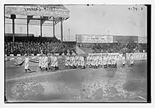 The opening game was against the Boston Red Sox on April 11, 1917, at the Polo Grounds in New York. 16,000 fans were in attendance. The Yankees lost 10-3. Major General Leonard Wood attended the game and threw out the first ball. Wood had drill sergeant Gibson, the recruiting officer from Macon, Georgia, where the team had their spring training, march the Yankees across the field in formation carrying rifles.[1]